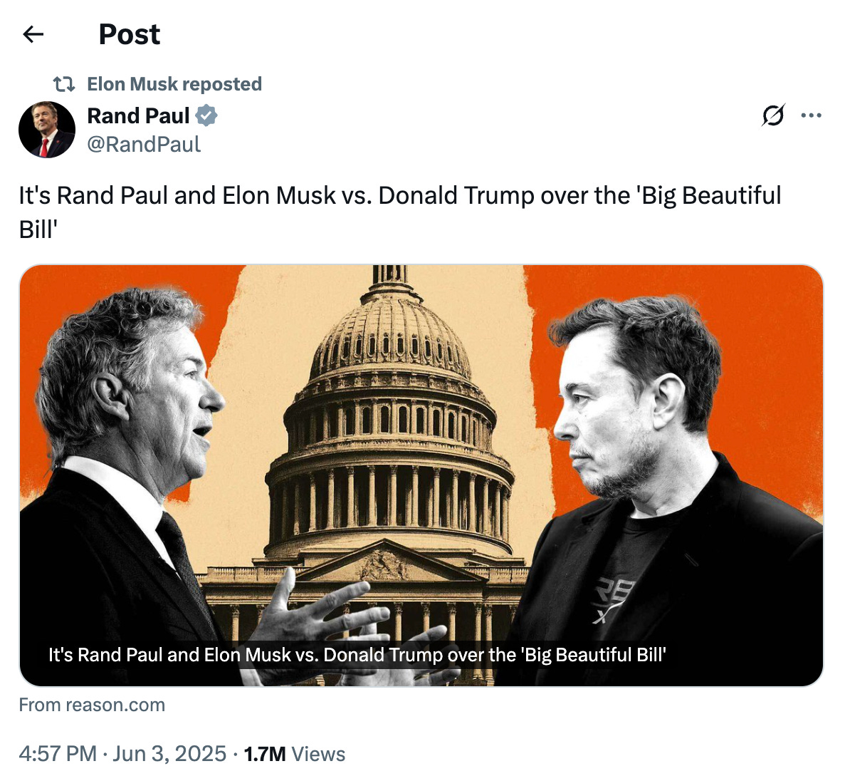 Last night, Musk seemed to acknowledge the oppositional posture he was assuming, retweeting an article from the libertarian outlet Reason with a not-so-subtle headline: “It’s Rand Paul and Elon Musk vs. Donald Trump over the ‘Big Beautiful Bill.’”