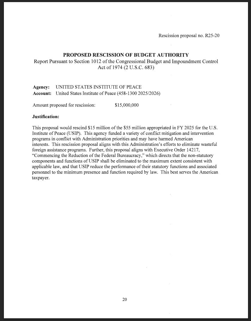 In addition to the U.S. Institute of Peace, the other targets were the U.S. Agency for International Development (USAID) and the Corporation for Public Broadcasting (CPB), which funds NPR and PBS, all agencies that DOGE has run into legal challenges trying to dismantle unilaterally. In the end, of the U.S. Institute of Peace’s $55 million budget, the administration only asked to cut $15 million; the controversial $500 million headquarters went unmentioned. (The administration has said future rescissions packages could follow.)