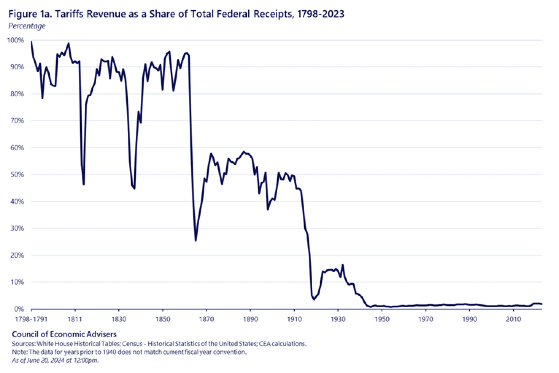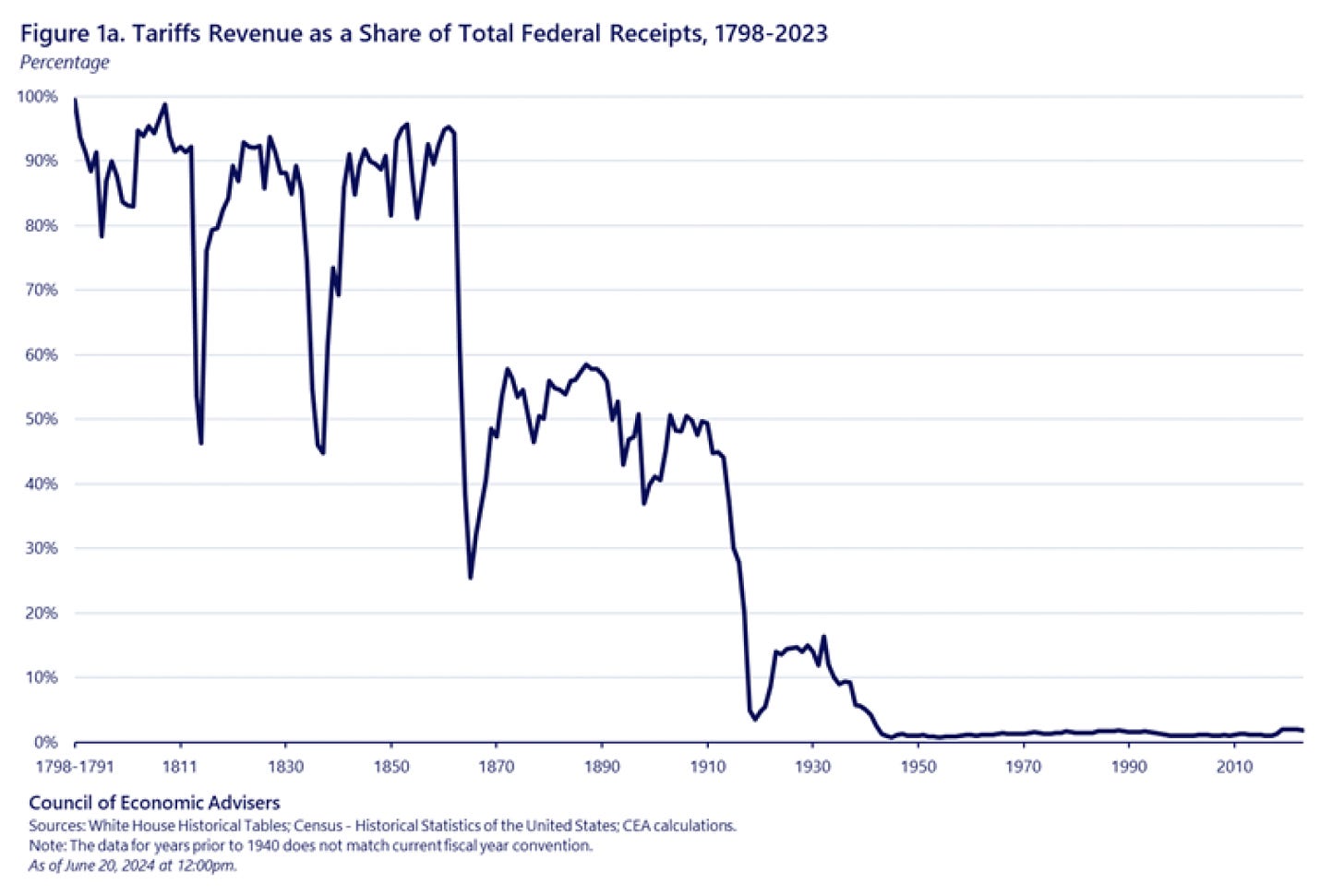 For the first half of American history, the U.S. generally kept tariffs quite high (see the first chart below); until the income tax emerged in the 1860s, and then was formalized with the 16th Amendment in 1913, they were the primary source of the U.S. government’s revenue (see the second chart).
