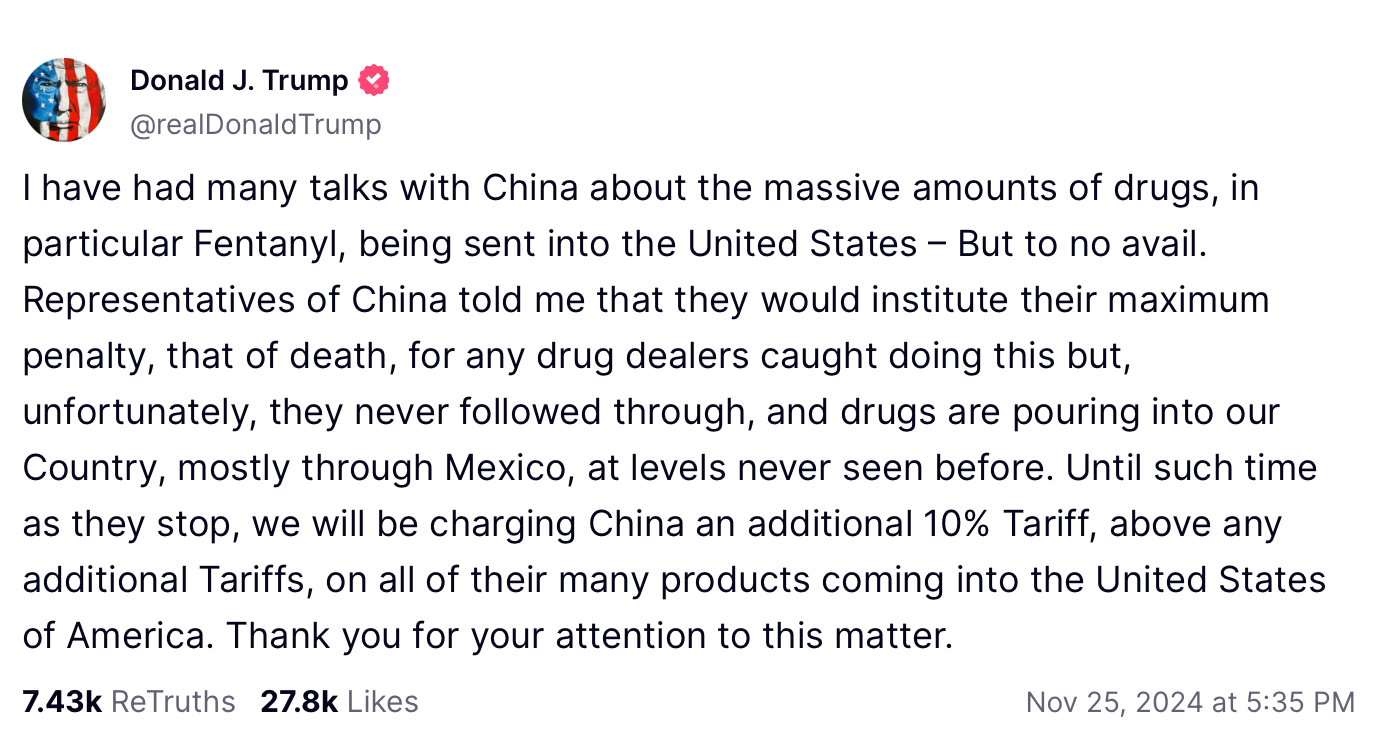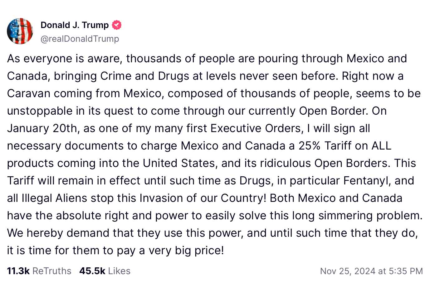 Which brings us to Trump’s Truth Social post yesterday evening, pledging to impose a 25% tariff on imports from Mexico and Canada on his first day in office, to remain in effect “until such time as Drugs, in particular Fentanyl, and all Illegal Aliens stop this Invasion of our Country!”