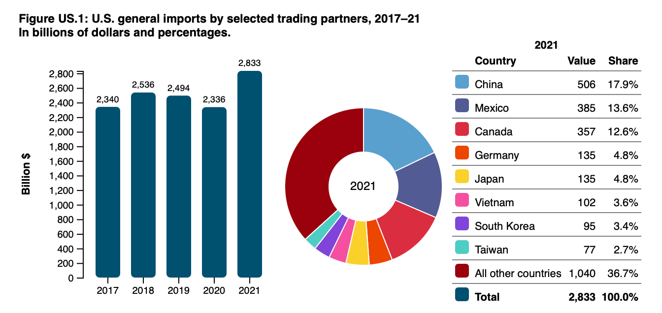 China, Mexico, and Canada — the three countries name-checked in Trump’s Truth Social posts — are the U.S.’ top trading partners. As of 2021, they accounted for a combined 44% of American imports; including both imports and exports, trade between the U.S. and those three countries totaled $2.5 trillion in 2022.
