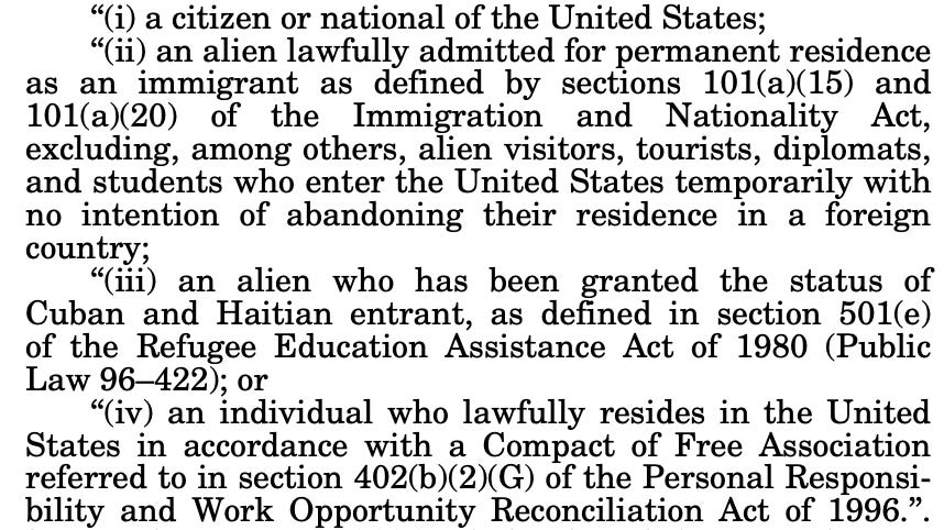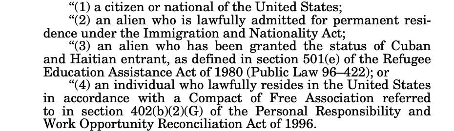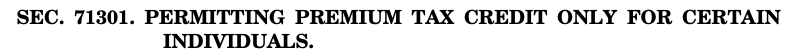Just like for Medicaid and Medicare, this section prohibits Obamacare premium tax credits from going to anyone other than citizens, permanent residents, Cuban and Haitian entrants, and individuals residing here under the Compact of Free Association.