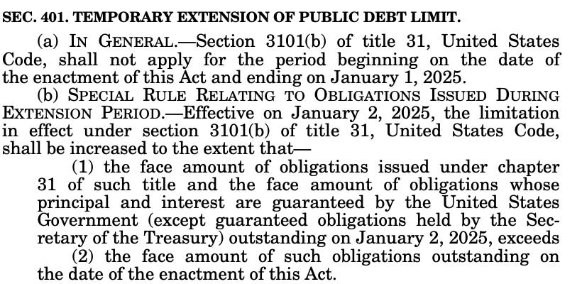Basically, the FRA — a bipartisan deal during the Biden era — didn’t set a hard number for the debt limit either. It just suspended the limit until January 1, 2025; after that, the law said, the new limit would just be the amount of debt the U.S. had accumulated up to that point. That number was $36.1 trillion. Hence, the new debt limit is $41.1 trillion.