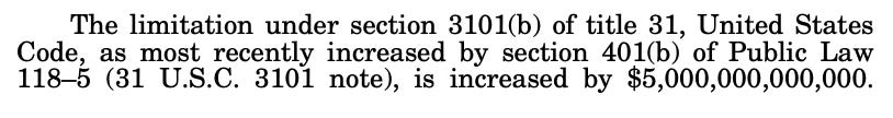 You’ll notice it doesn’t actually say how high the debt limit is now. Let’s find out together. We’ll start with Public Law 118-5, better known as the Fiscal Responsibility Act (FRA) of 2023, which was the last legislative vehicle to raise the debt ceiling:
