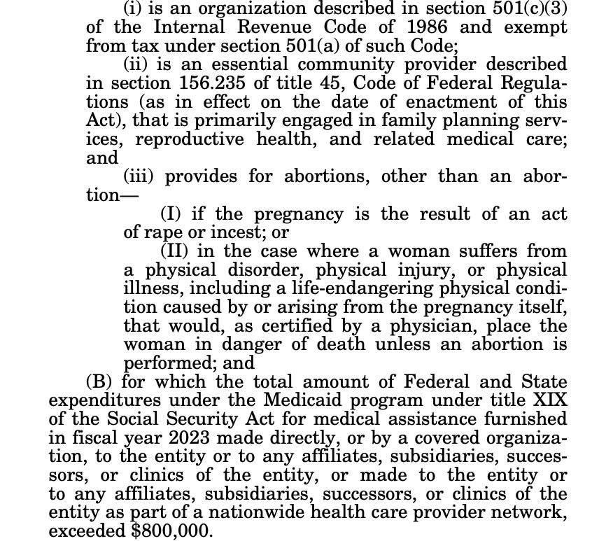 The words “Planned Parenthood” aren’t mentioned anywhere there, but they are the only tax-exempt organization “primarily engaged in family planning, in family planning services, reproductive health, and related medical care” that “provides for abortions” other than for rape, incest, and the life of the mother and receives more than $800,000 annually from Medicaid.
