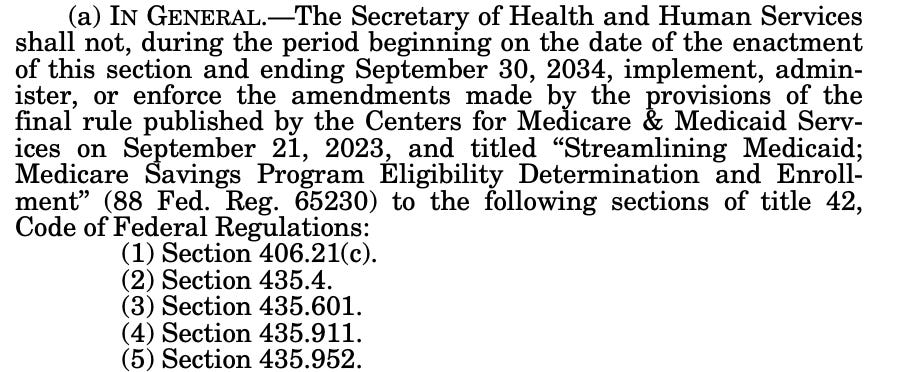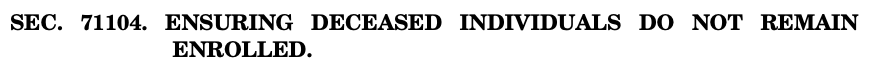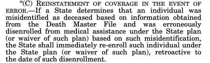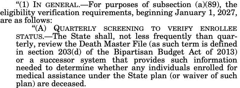 Starting in 2027, every quarter, states will have to review the Death Master File (great band name!) kept by the Social Security Administration to ensure that no one enrolled in Medicaid in their state has died without their knowledge. Any deceased enrollees will be disenrolled.