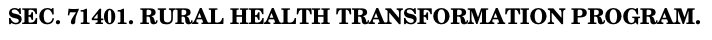 In particular, the National Rural Health Association estimates that the changes to Medicaid outlined above would lead to almost $70 billion less money coming into rural hospitals, which will lead to some closing. This is why the final section of Subtitle B introduces something called the “Rural Health Transformation Program,” a new fund that will be distributed to rural hospitals to make up for the lost revenue from individuals who won’t be using their services after losing Medicaid coverage.