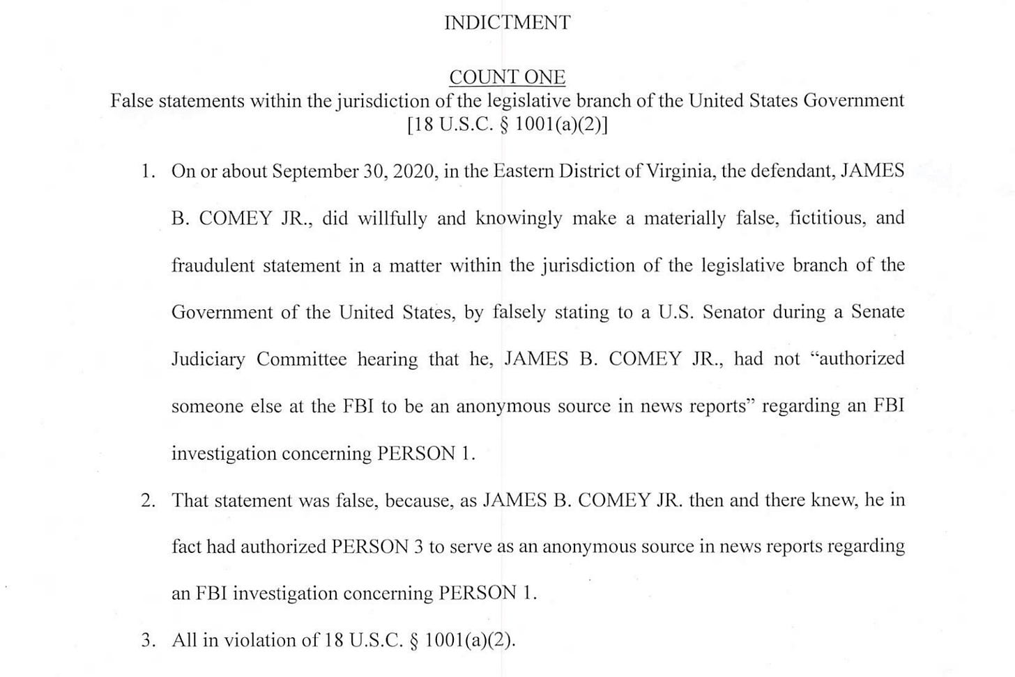 “That statement was false,” the indictment says, “because, as JAMES B. COMEY JR. then and there knew, he in fact had authorized PERSON 3 to serve as an anonymous source in news reports regarding an FBI investigation concerning PERSON 1.” (Why isn’t there a Person 2? We’ll get to that later on.)