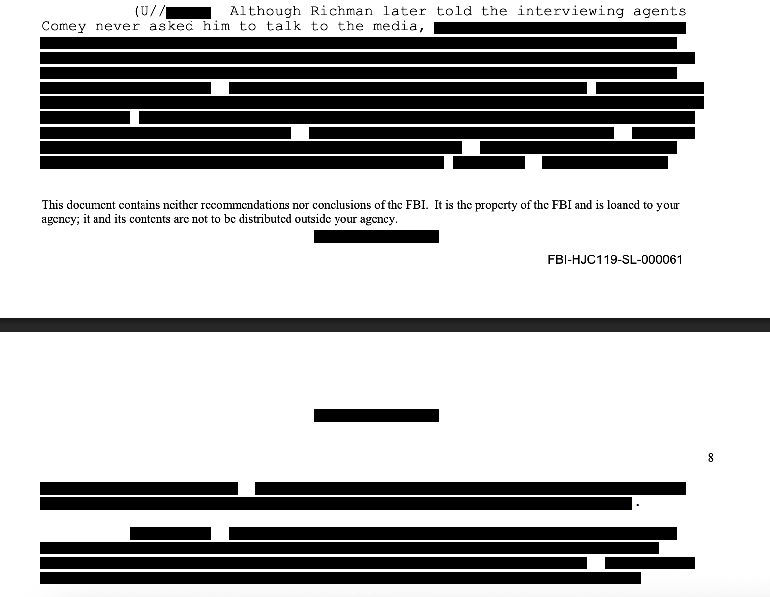 According to the New York Times, Richman’s interview with prosecutors this month was “not helpful in their efforts to build a case,” so presumably he told the DOJ the same thing he told the “Arctic Haze” investigators. So if the DOJ has a meaningful case against Comey, it’s probably contained in these redactions: everything after “Although Richman later told the interviewing agents Comey never asked him to talk to the media…”