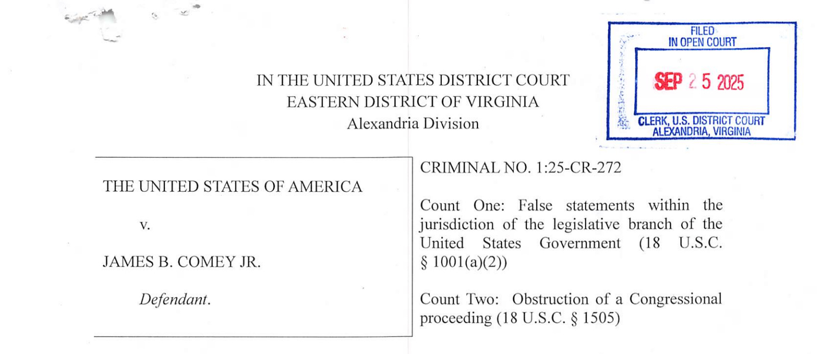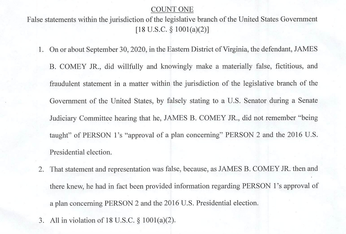 The very first entry on the docket: “INDICTMENT as to James B. Comey, Jr. count(s) 1, 2.” Here is the link. Let’s start reading.