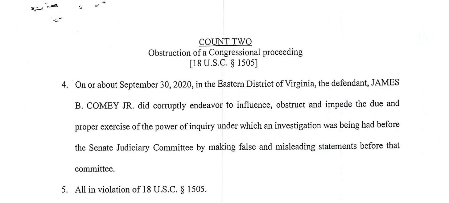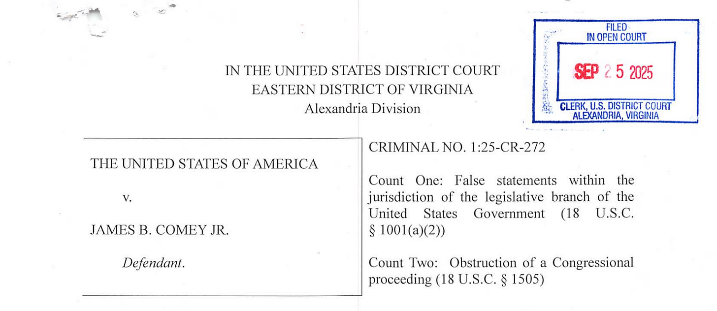 I did this recently with a six-part series breaking down the One Big Beautiful Bill. This morning, I’m expanding my “Reader’s Guide” franchise, with a document that is much shorter, but also consequential: the indictment of former FBI Director James Comey. As with the Big Beautiful Bill guides, we won’t only dwell on the main text itself. I’ll also bring in other primary sources as context — statutes, congressional testimony, inspector general reports — to give you a full understanding of what Comey has been accused of.