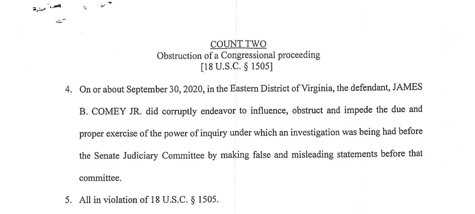 The header of the indictment also includes a summary of the two counts Comey has been charged with, as well as the venue. There are 94 federal district courts in the United States; Comey has been charged in the Eastern District of Virginia, at its courthouse in Alexandria. This is because the indictment centers around testimony Comey gave to Congress remotely during the pandemic, speaking over videoconference from his home in McLean, Virginia.
