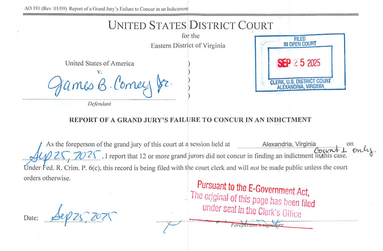 Because the next entry on the Comey document is: “Report of a Grand Jury’s Failure to Concur in an Indictment by USA as to James B. Comey, Jr.” That sounds interesting: