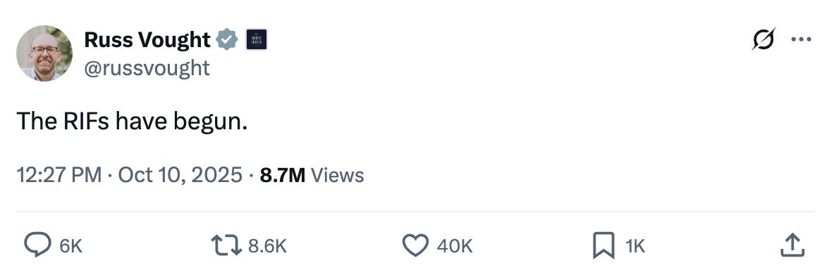 That changed on Friday, when Vought posted on X: “The RIFs have begun,” referring to “reductions in force,” which is what the federal government calls layoffs.