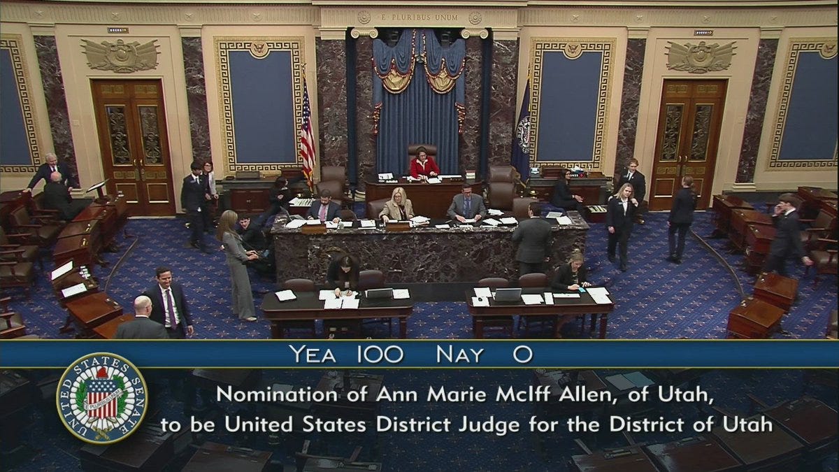 👩⚖️The Senate voted unanimously to confirm Ann Marie McIff Allen as a U.S. district judge in Utah. It was the chamber’s first 100-0 roll call vote since April 2022. (Unanimous matters are generally resolved by voice vote.) The chamber also confirmed two other district judges, placing President Biden’s number of judicial confirmations (193) even with former President Donald Trump’s at this point in his term.