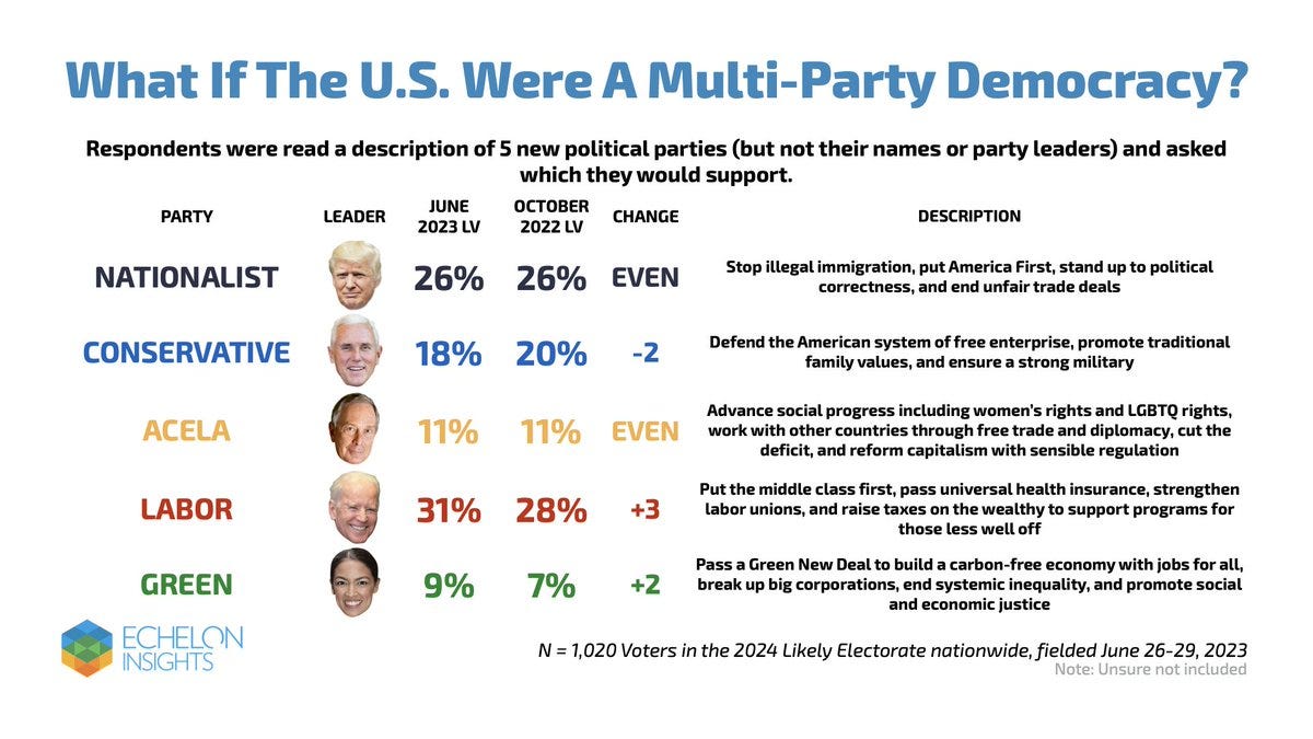 The polling firm Echelon Insights regularly conducts great surveys where they ask how American voters would fall into in an imagined five-party system. Below are their most recent (July 2023) results: