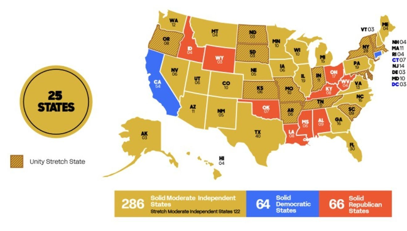 The organization said their source for this map was polling data which showed a “whopping 59% of voters say they would consider a moderate independent ticket in the 2024 race.”