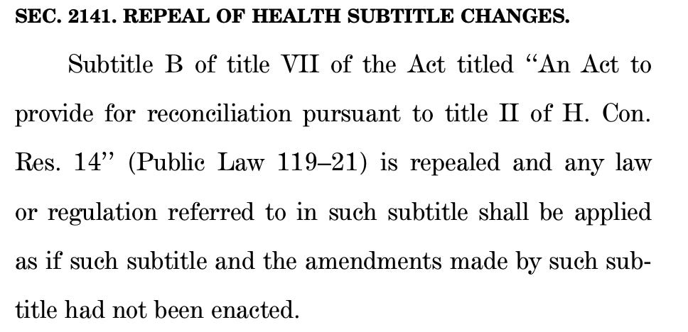 This provision repeals the entire subtitle of the One Big Beautiful Bill Act (OBBBA) dealing with health care. That means it would undo, most prominently, the new Medicaid work requirements that were passed as part of the law. But there are also other OBBBA provisions that would be swept away, which are at issue here.