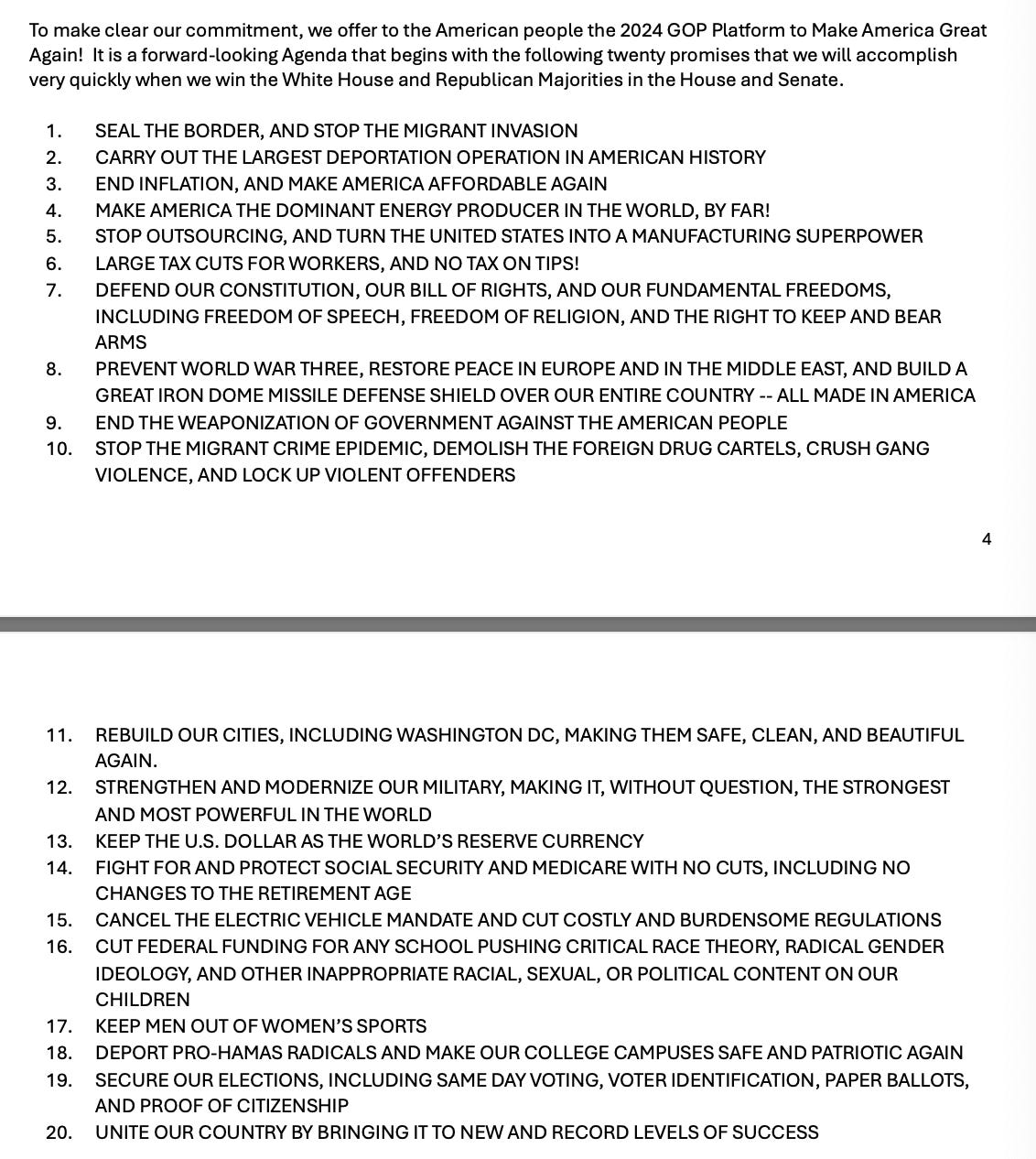 The platform begins with 20 principles — in all-caps — promising to “MAKE AMERICA AFFORDABLE AGAIN” and “PREVENT WORLD WAR THREE,” among other commitments.