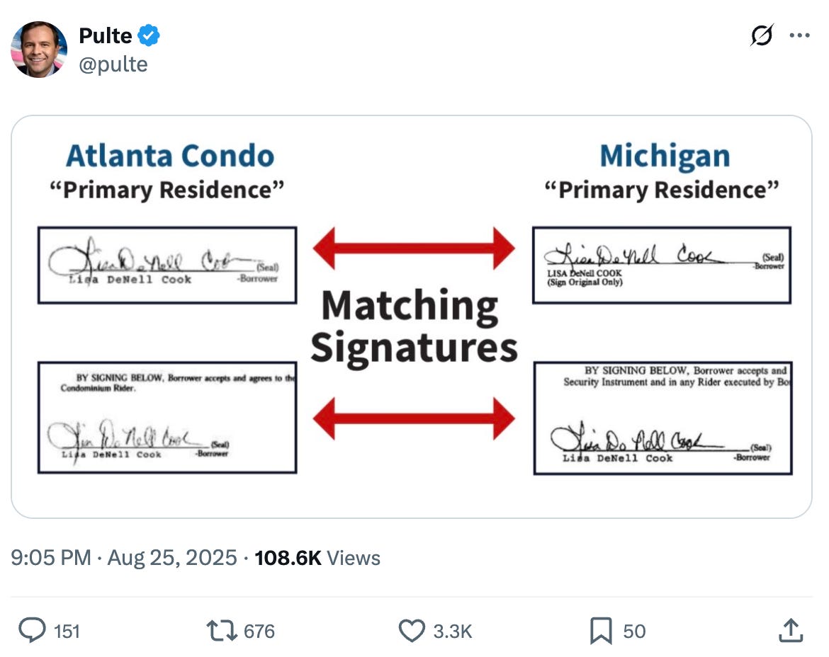 Notably, Cook said last week that she is “gathering the accurate information to answer any legitimate questions and provide the facts,” but has yet to provide any evidence rebutting Pulte’s claims. At the same time, she has not been criminally charged by the Justice Department.