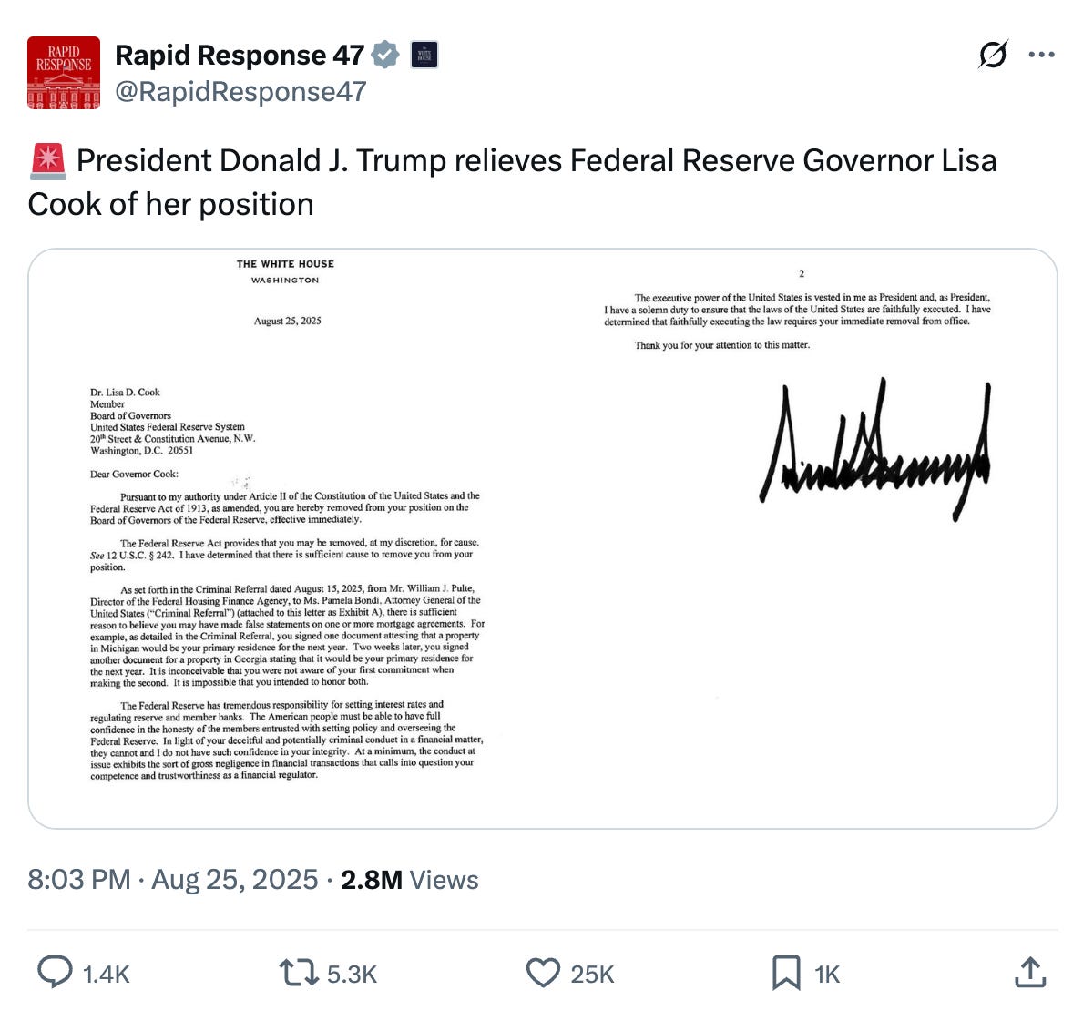 Trump cited the Federal Reserve Act, codified at 12 U.S.C. § 242, which allows the president to prematurely remove a Fed governor “for cause.” Trump wrote Cook that he had “determined that there is sufficient cause to remove you from your position” based on a criminal referral sent to the Justice Department last week by Federal Housing Finance Agency (FHFA) Director Bill Pulte, who accused Cook of committing mortgage fraud.
