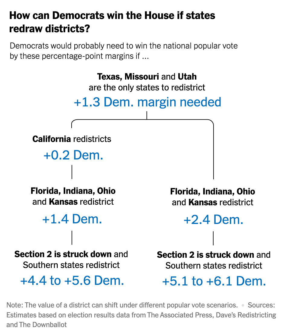 If the court strikes down — or weakens — Section 2 of the 1965 law, Republicans would stand to gain mightily. If the justices do so in time for Southern states to redraw their congressional maps before the 2026 midterms, when combined with other Republican mid-decade redistricting, Nate Cohn of the New York Times estimates that Democrats would have to win the nationwide House popular vote by around 4-5 percentage points next year to win a majority — or 5-6 points if a Democratic redistricting referendum fails in California.