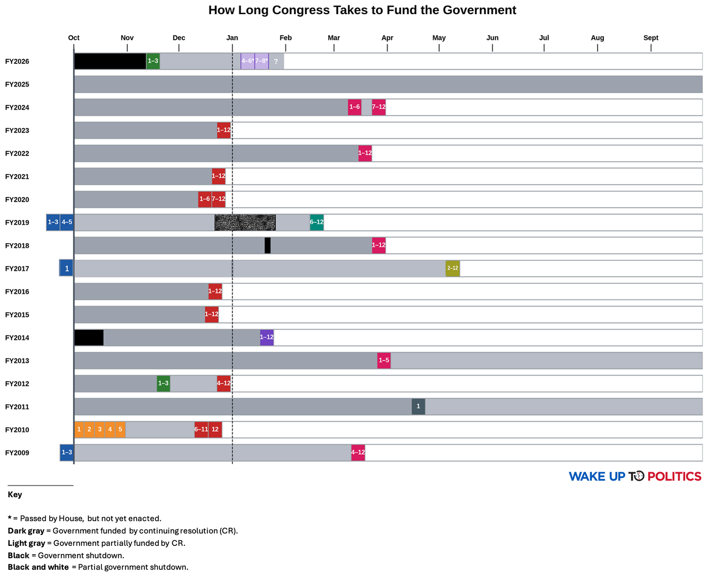 The dirty secret of government spending bills is that they always require bipartisan support, since the 60-vote Senate filibuster ensures that spending bills can’t pass without cross-party buy-in. That threshold is sometimes so hard to reach that the process collapses (as in FY 2025). And sometimes it frustrates both parties so much that they muse about getting rid of the filibuster when they’re in the majority.