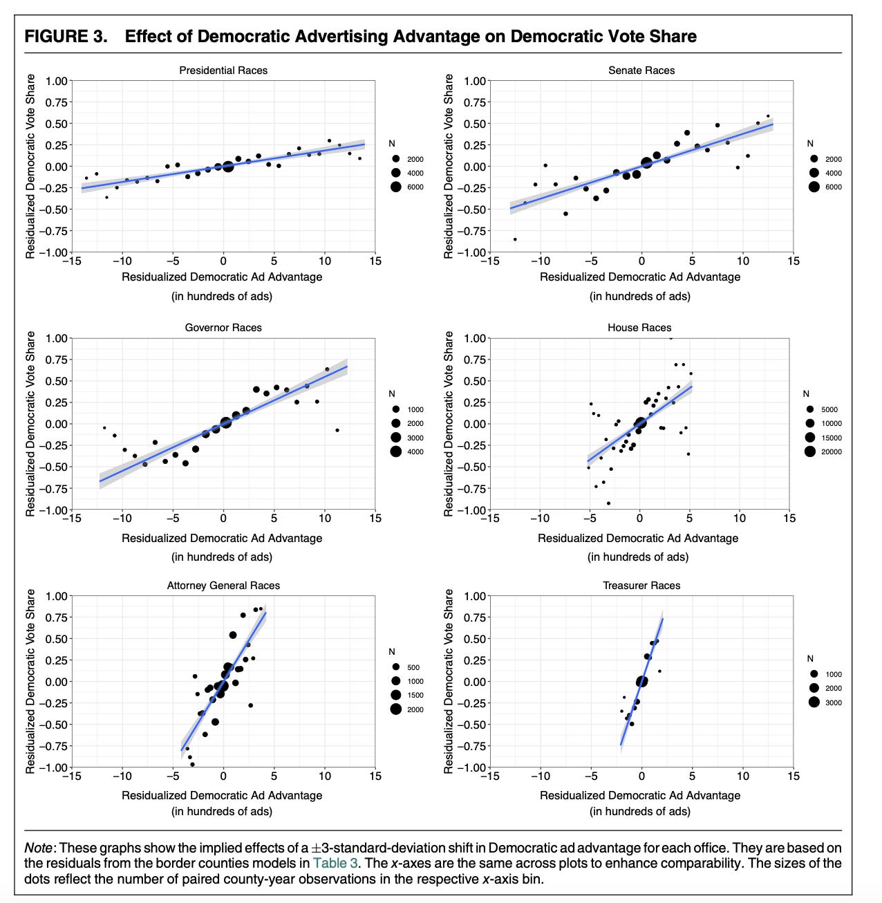 The 2022 study I mentioned before also looked at this, studying 331 Senate elections, 226 gubernatorial elections, 3,859 House elections, and 237 other state-level elections between 2000 and 2018, again with an eye on TV spending. Campaign ads might not make a huge impact on the presidential race, but their effect on downballot races — where voters have much less defined views of the candidates — was considerably larger.