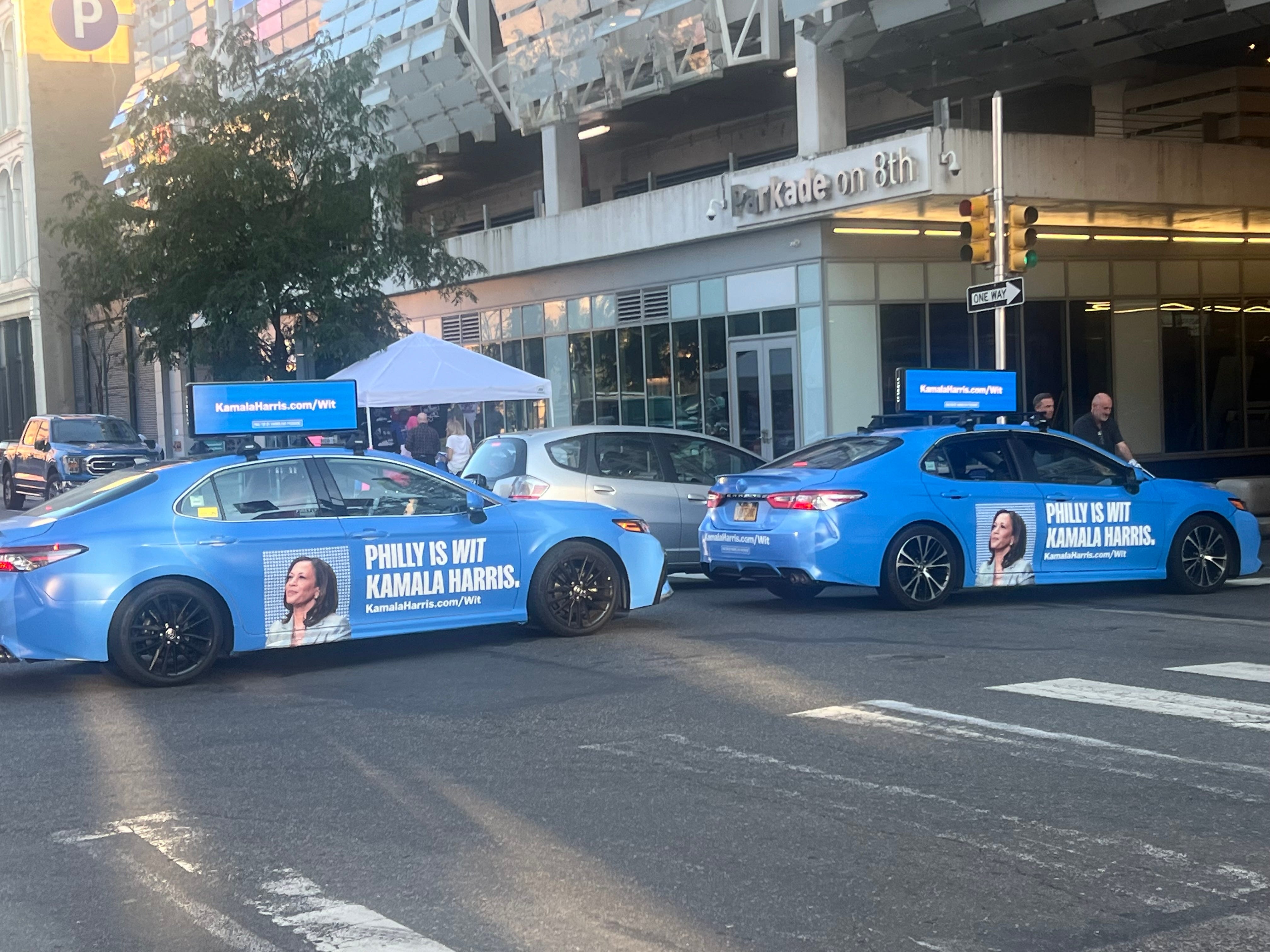 Before the debate, walking around outside, I also spotted this fleet of cars, which the campaign had apparently bought simply to drive around the city all night and inform everyone that Philly was “wit” Harris (a reference to the cheesesteak order).