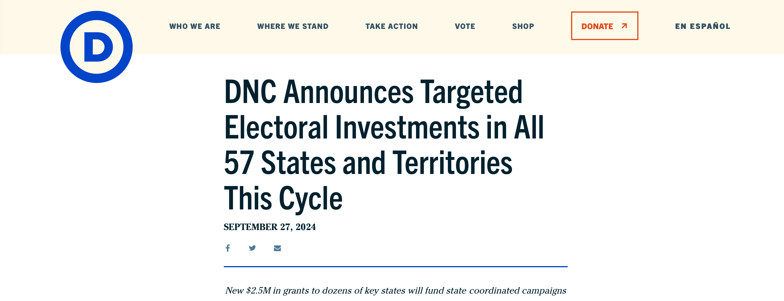 The Democratic National Committee is so flush with cash that, at this pivotal stage of a high-stakes presidential election, it’s sending money to the Democratic Party committees in all 57 U.S. states and territories. It’s the first time the party has ever done this.