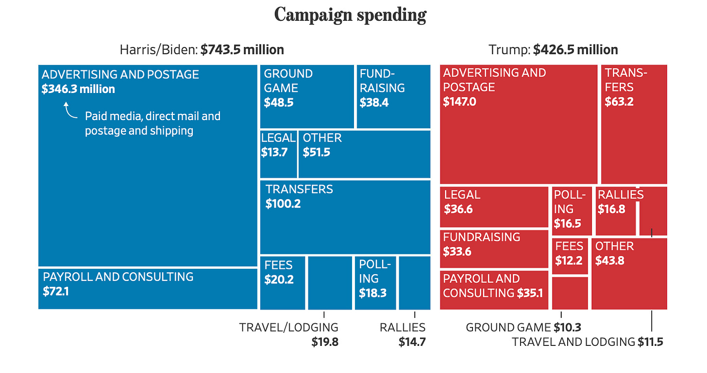 We don’t have hard data on the effects of every aspect of presidential campaign spending — but one area with ample research into it is paid advertising, which just so happens to be the biggest expense for both Trump and Harris: