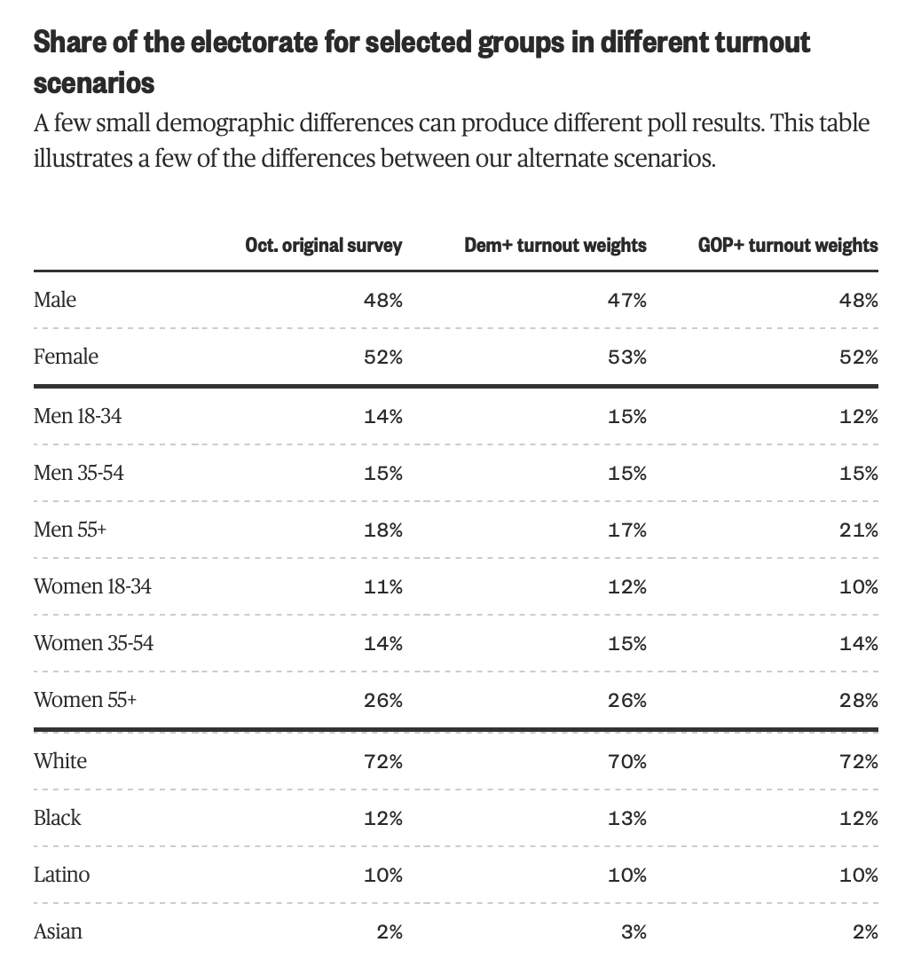 1. We don’t know the denominators yet. I know a lot of you are skeptical of polls. I understand that. I am too, sometimes. But the nice thing about polls is they represent at least an attempt to model out the overall electorate. Pollsters don’t just take every response they receive, count them up, and click “publish.” Before finalizing their results, they weight the responses of different demographic groups differently, ensuring that each group’s responses are taken into account in accordance with informed predictions of what the final electorate will look like.