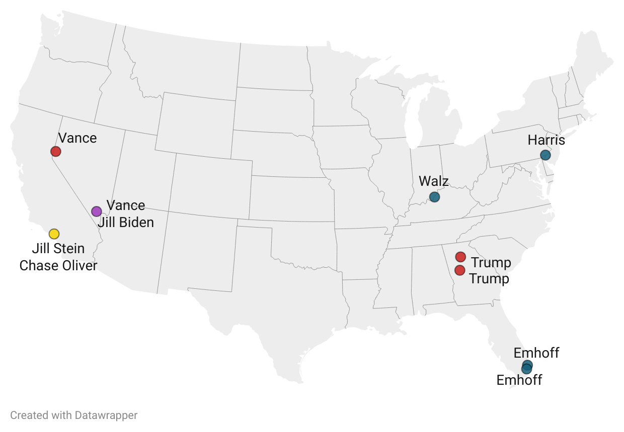 Donald Trump will address a “Believers and Ballots” town hall in Zebulon, Georgia and a Turning Point Action rally in Duluth, Georgia. JD Vance will hold campaign events in Las Vegas and Reno, Nevada.
