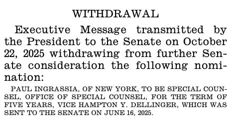 One of the additional withdrawals was well-documented: Trump pulled Paul Ingrassia’s bid to become head of the Office of Special Counsel, after several Senate Republicans announced they would oppose his nomination due to leaked texts in which he said he had a “Nazi streak.”