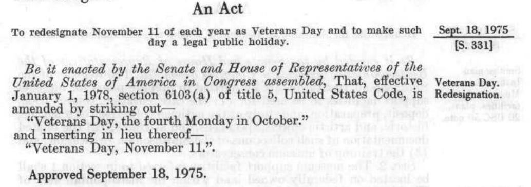 In September 1975, Congress relented and passed a new law returning Veterans Day to November 11:
