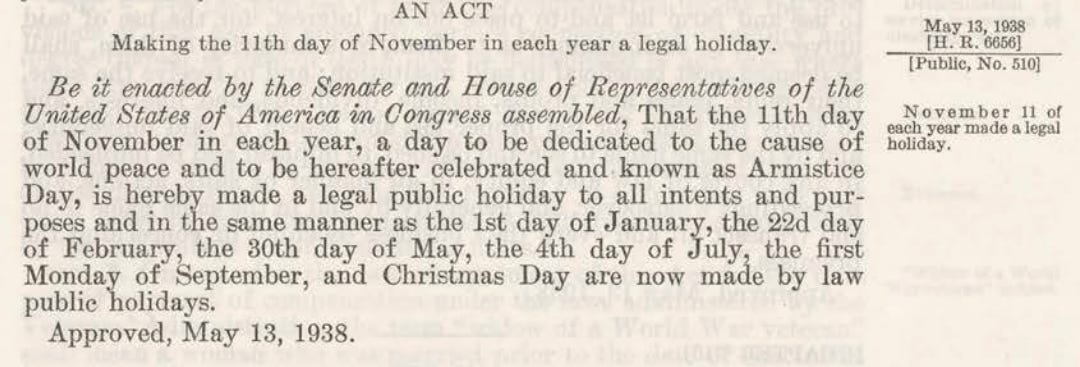 Congress made it a legal holiday — “a day to be dedicated to the cause of world peace and to be hereafter celebrated and known as Armistice Day” — with this law in 1938: