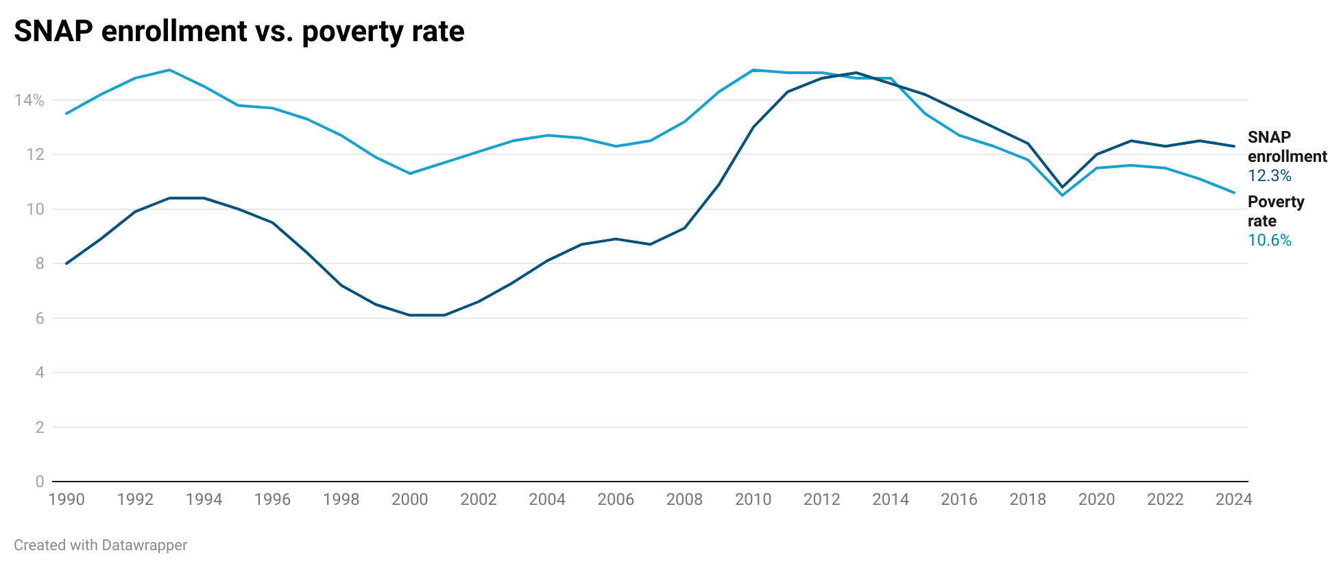 I put together this chart, comparing the percentage of Americans enrolled in SNAP since 1990 to the percentage of Americans in poverty (per the Census Bureau) over the same time period: