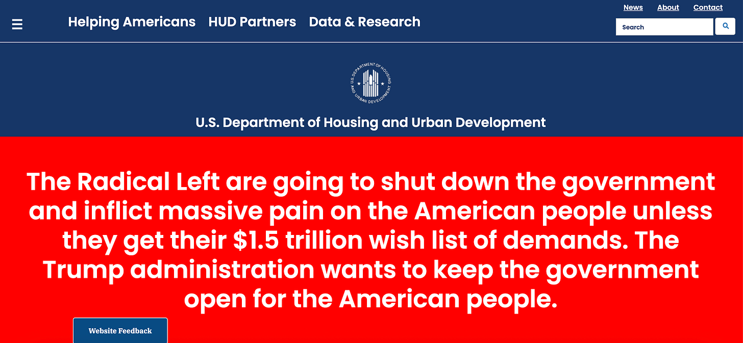 This could always change, however. Both parties will now spend the coming days trying as hard as they can to pin the shutdown on the other — a goal Trump will likely use the full force of the federal government to advance. (Below, see the current home page of the Department of Housing and Urban Development website.) We’ll see if those numbers change as the effects of the shutdown become real, and as the dueling partisan messaging machines kick into gear.