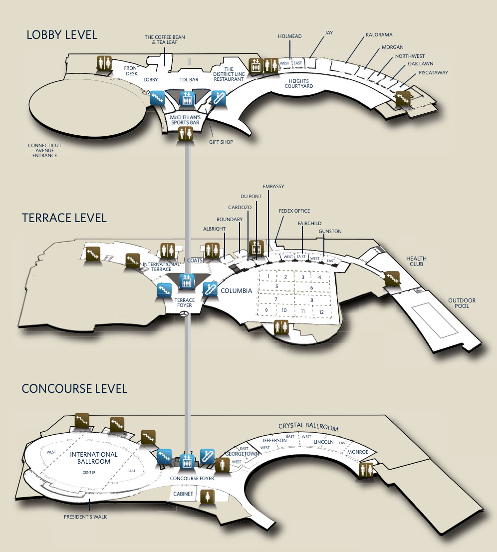 To give you a sense of where Allen was in relation to the president: In the floor plan below, the Correspondents’ Dinner is held on the Hilton’s “Concourse Level,” in the cavernous “International Ballroom.” The magnetometers are set up in the “Terrace Level,” one floor above the dinner. That’s as far as Allen made it. Above that is the lobby and 12 floors of rooms.