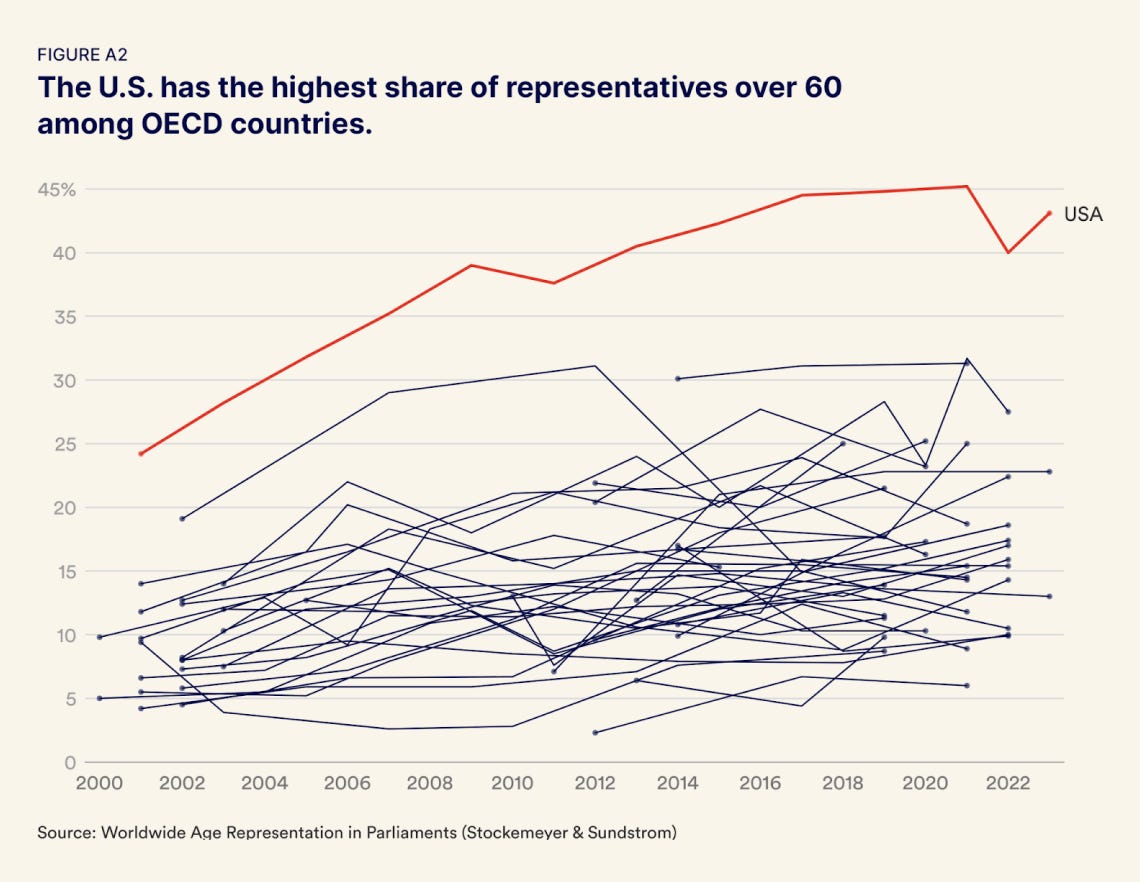 The United States has (by far) the highest share of lawmakers over 60 among developed democracies, per a new report by the New America and Protect Democracy think tanks.