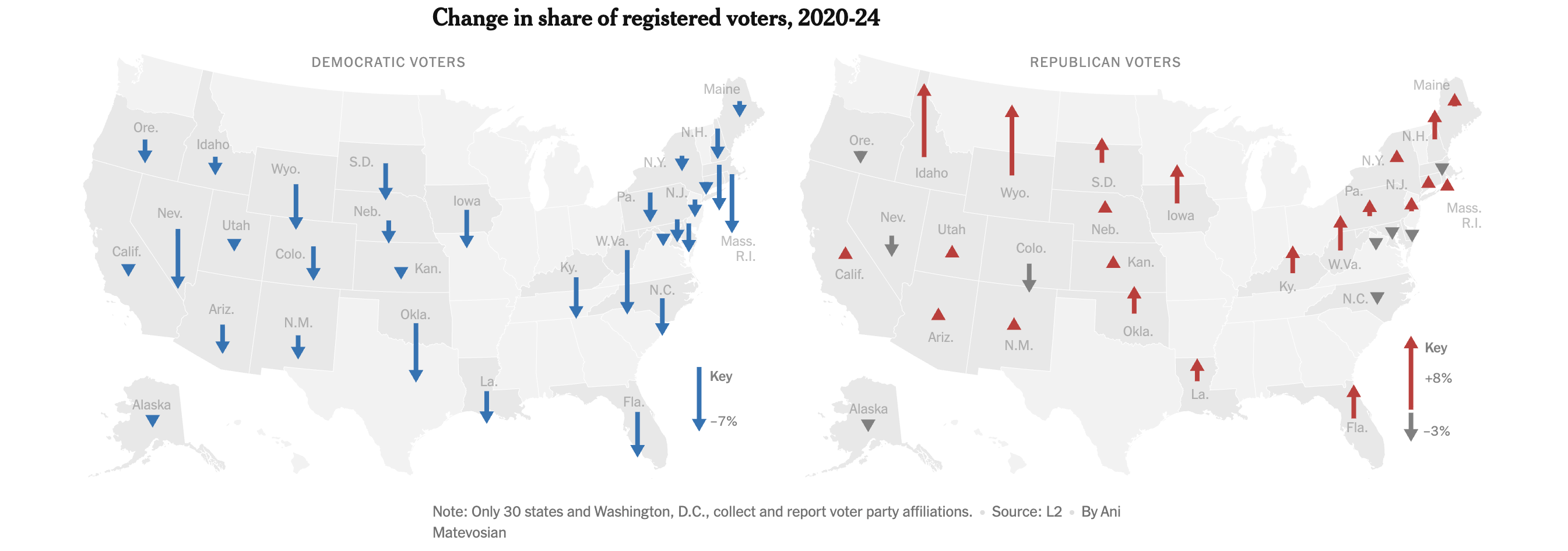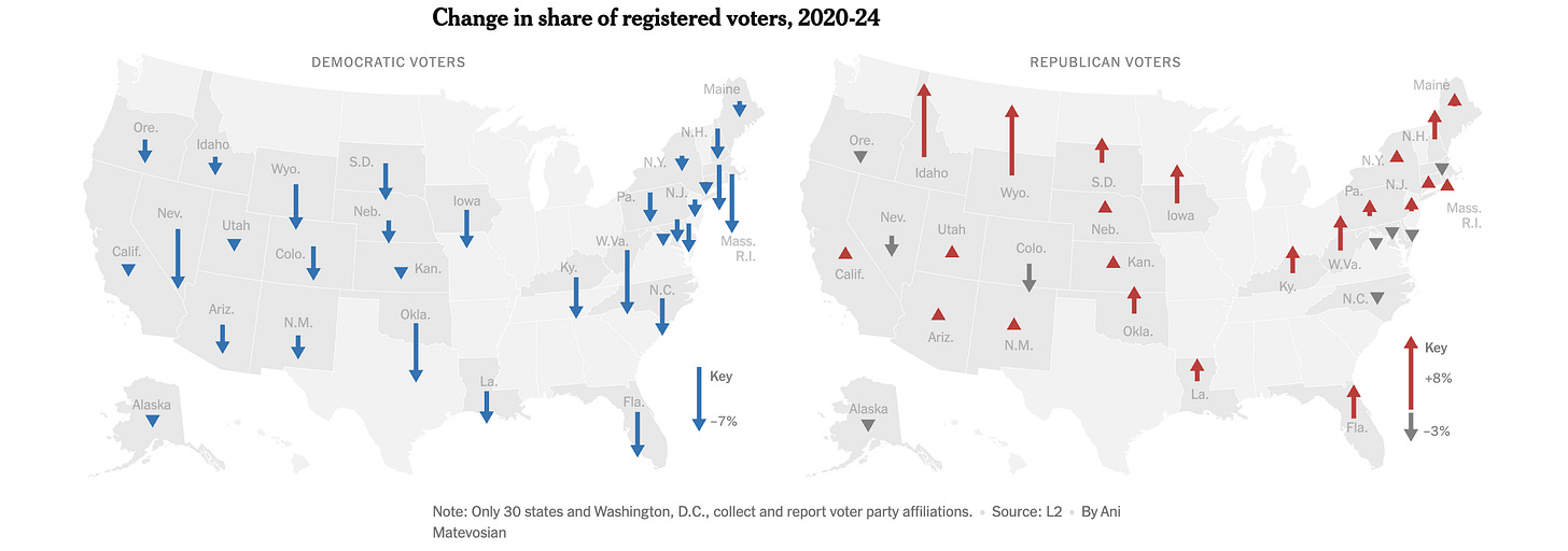 “Of the 30 states that track voter registration by political party,” the New York Times reports, “Democrats lost ground to Republicans in every single one between the 2020 and 2024 elections — and often by a lot.”