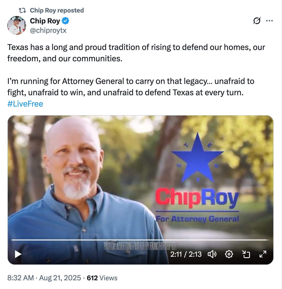 Rep. Chip Roy (R-TX) announced plans this morning to run for Texas Attorney General, seeking to fill the post being vacated by Ken Paxton, who is mounting a primary challenge against Sen. John Cornyn (R-TX). Roy, a leader of the House Freedom Caucus, has often been a thorn in the side of House Republican leadership, forcing procedural delays to block bills he views as insufficiently conservative.