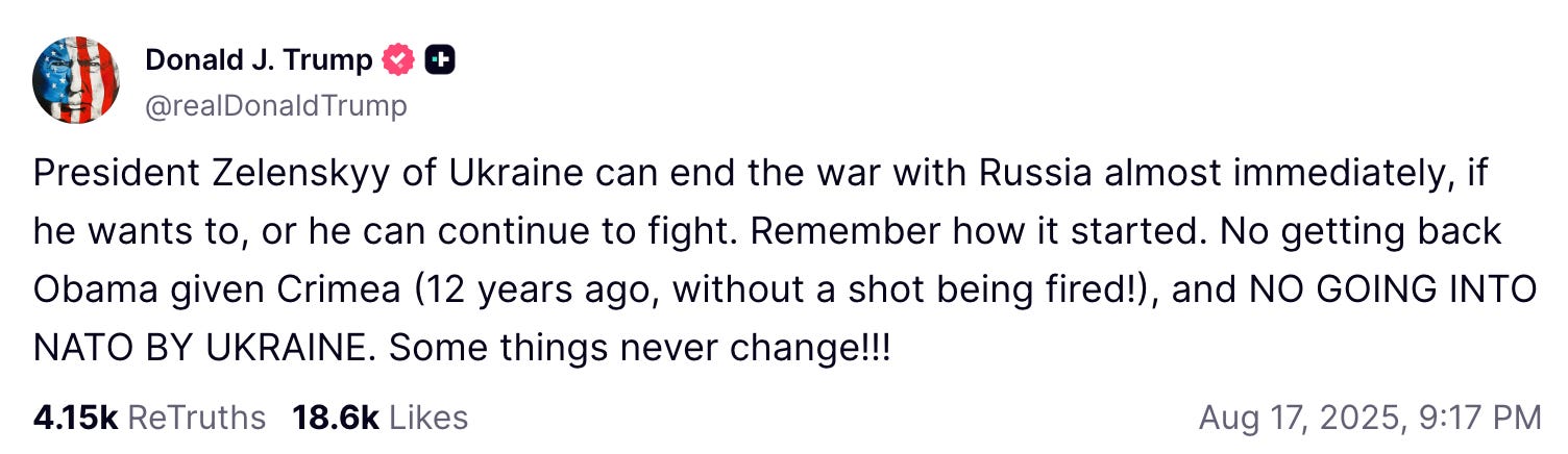 In the meantime, Trump seems to have embraced at least two of Putin’s demands, per a Truth Social post last night: Russia formally taking over Crimea, and Ukraine remaining out of NATO. (No mention of “Article V-like” security guarantees there.)