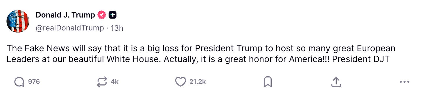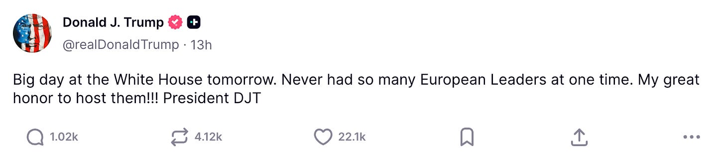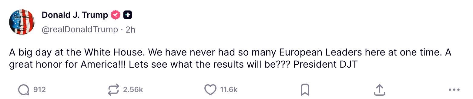 In that vein, this is another perfectly transparent effort to get Trump on Zelensky’s side, by surrounding him with leaders Trump is known to like. Perhaps anticipating mockery on this score, Trump has put out three Truth Social posts in the last 24 hours insisting that, actually, it is a “great honor” to have them all. (“We have never had so many European Leaders here at one time,” Trump noted.)