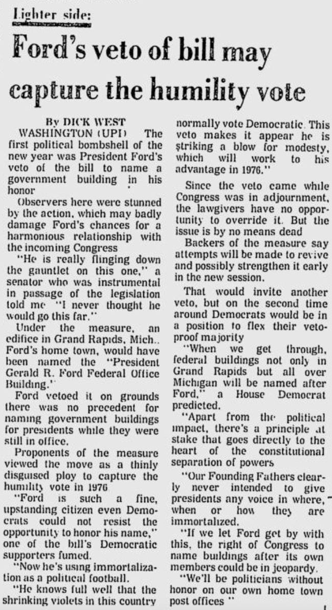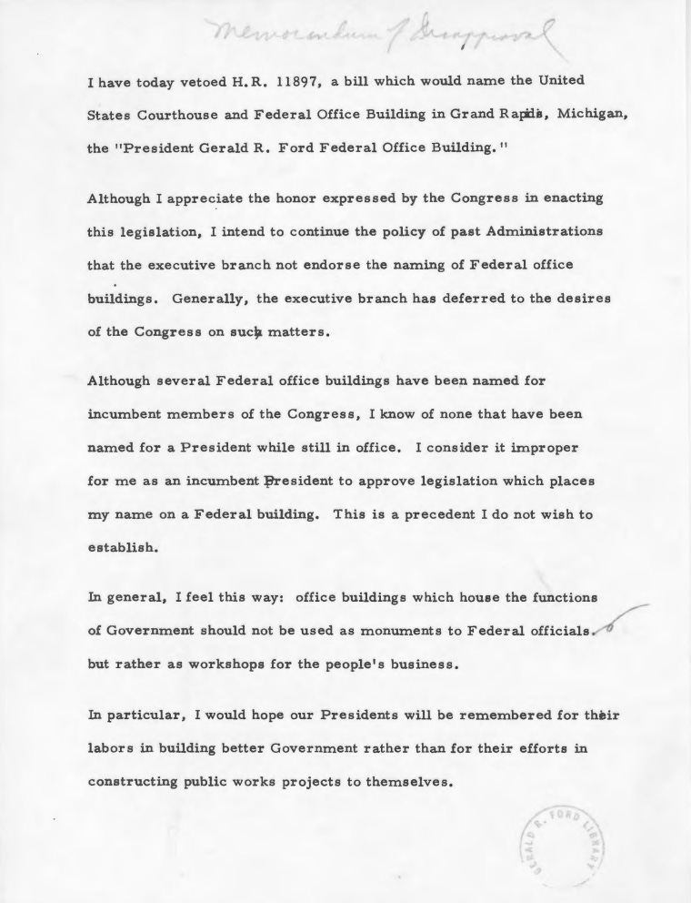 “Generally, the executive branch has deferred to the desires of the Congress on such matters,” Ford acknowledged in a veto statement. “However, I know of no Federal office buildings that have been named for a President while still in office. This legislation might begin a precedent I believe it best not to establish.”