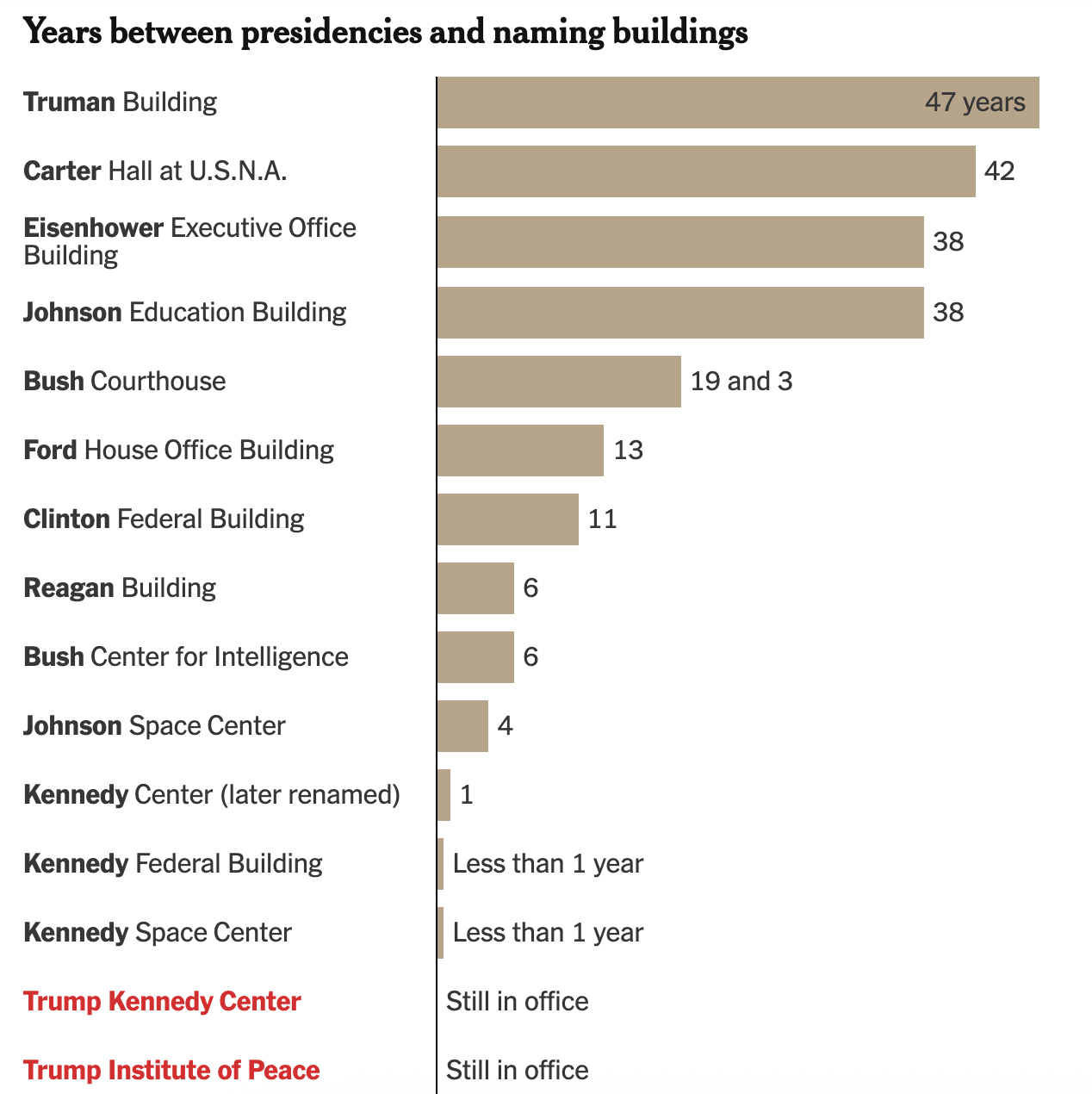 Trump’s naming bonanza is without precedent in American history: most previous presidents have shied away from placing their names on buildings or other projects, waiting until after they leave the White House to accept such honors, as the below New York Times graphic shows.