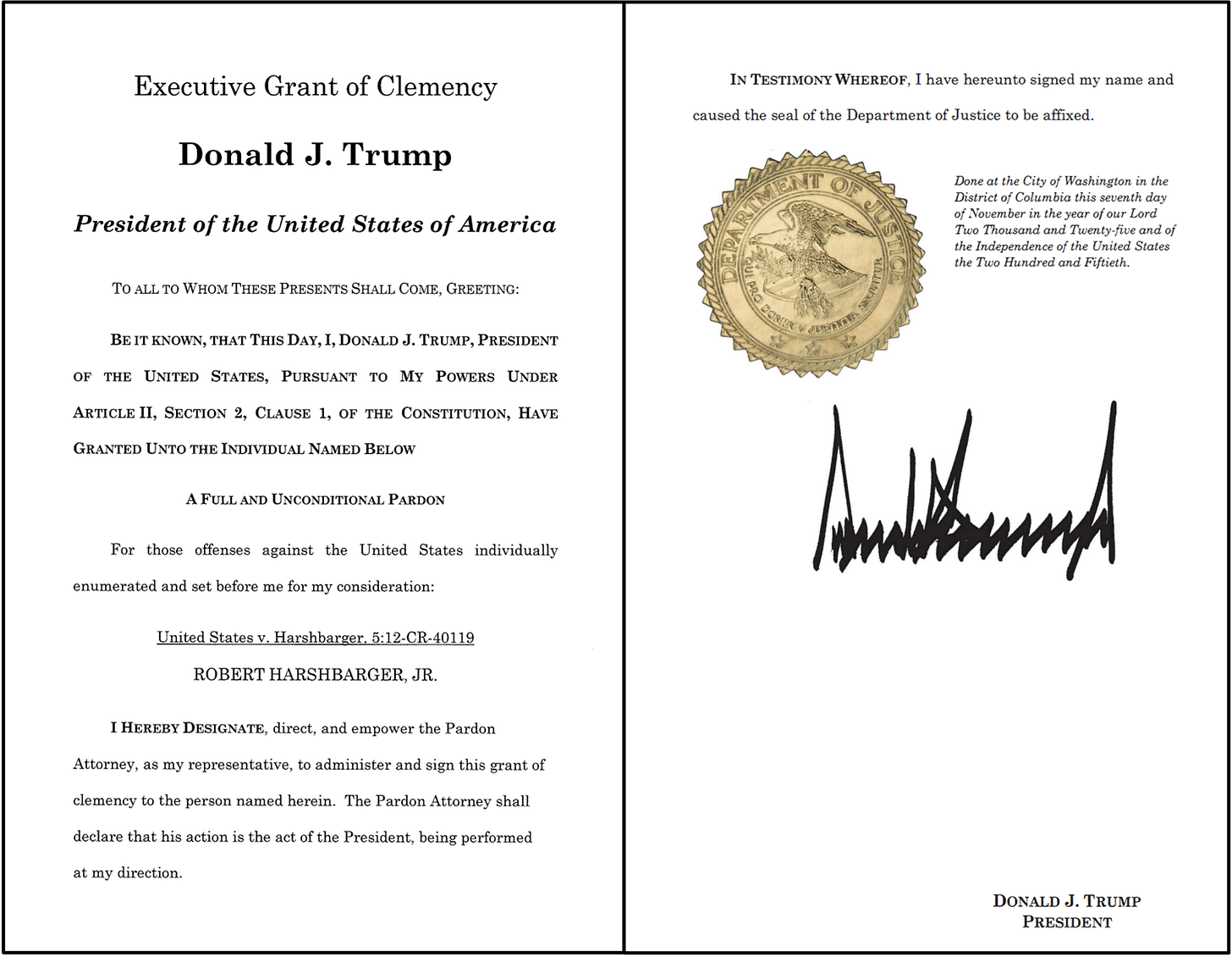 Harshbarger joins a group of roughly 1,500 people whom Trump has pardoned since returning to office about 10 months ago.