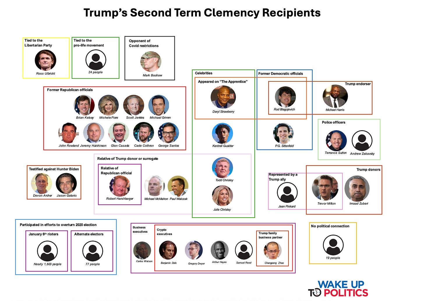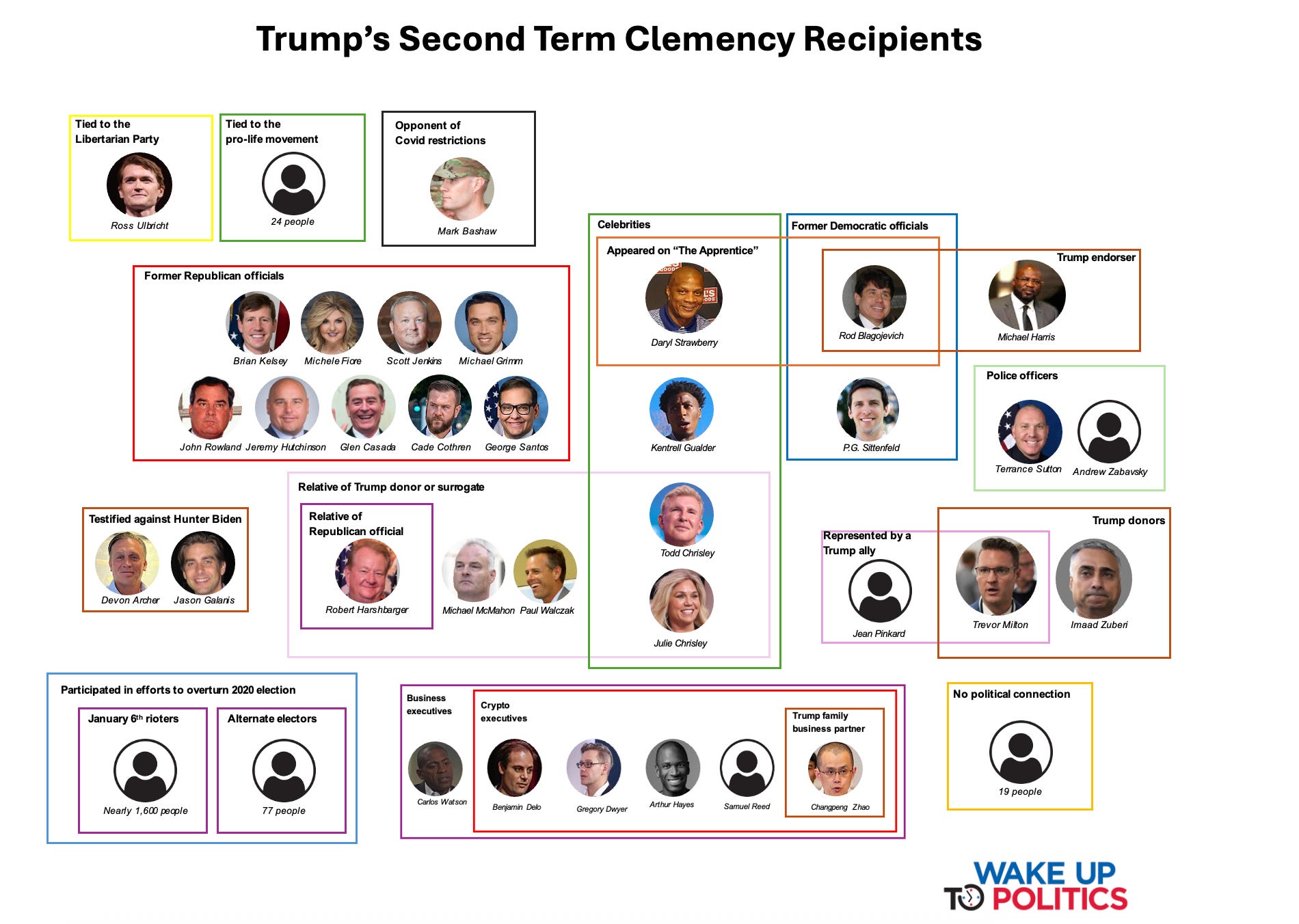 Many of Trump’s other second-term clemency recipients are tied to him or his orbit: Trevor Milton, who was convicted of defrauding investors in his company Nikola, was pardoned after donating almost $1 million to the Trump campaign or political groups backing Trump. Paul Walczak, convicted of tax crimes, was pardoned one month after his mother attended a $1 million-per-seat Trump fundraiser. Changpeng Zhao was pardoned after the crypto exchange he founded, Binance, struck a deal with the Trump family company.