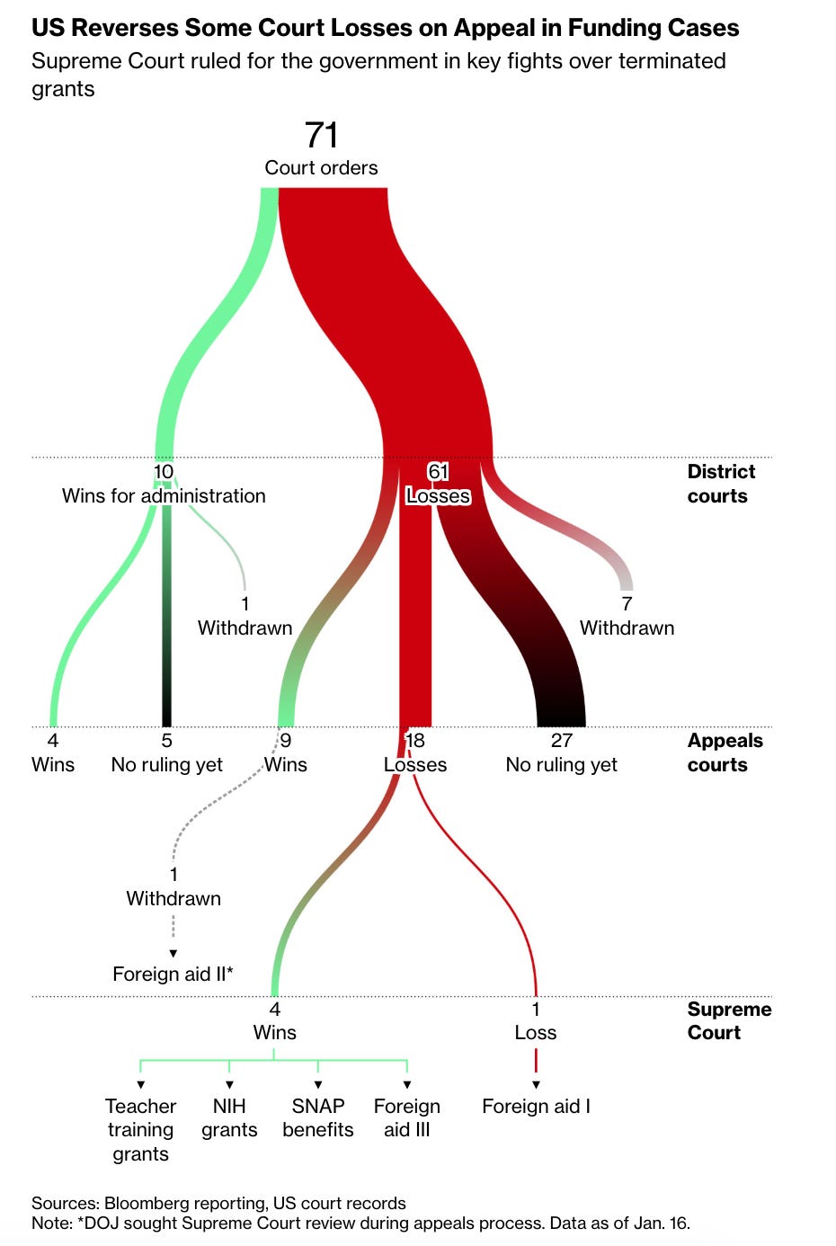 As the below graphic by Bloomberg shows, this has largely been a losing battle. Just as he has lost a majority of court cases overall, Trump’s funding cases have mostly generated losses for him. (Trump has won all four of these cases that he has appealed to the Supreme Court on an emergency basis — but, notably, he opted not to rush his 57 other losses to the justices, perhaps a sign that he views the other cases as losing battles.)