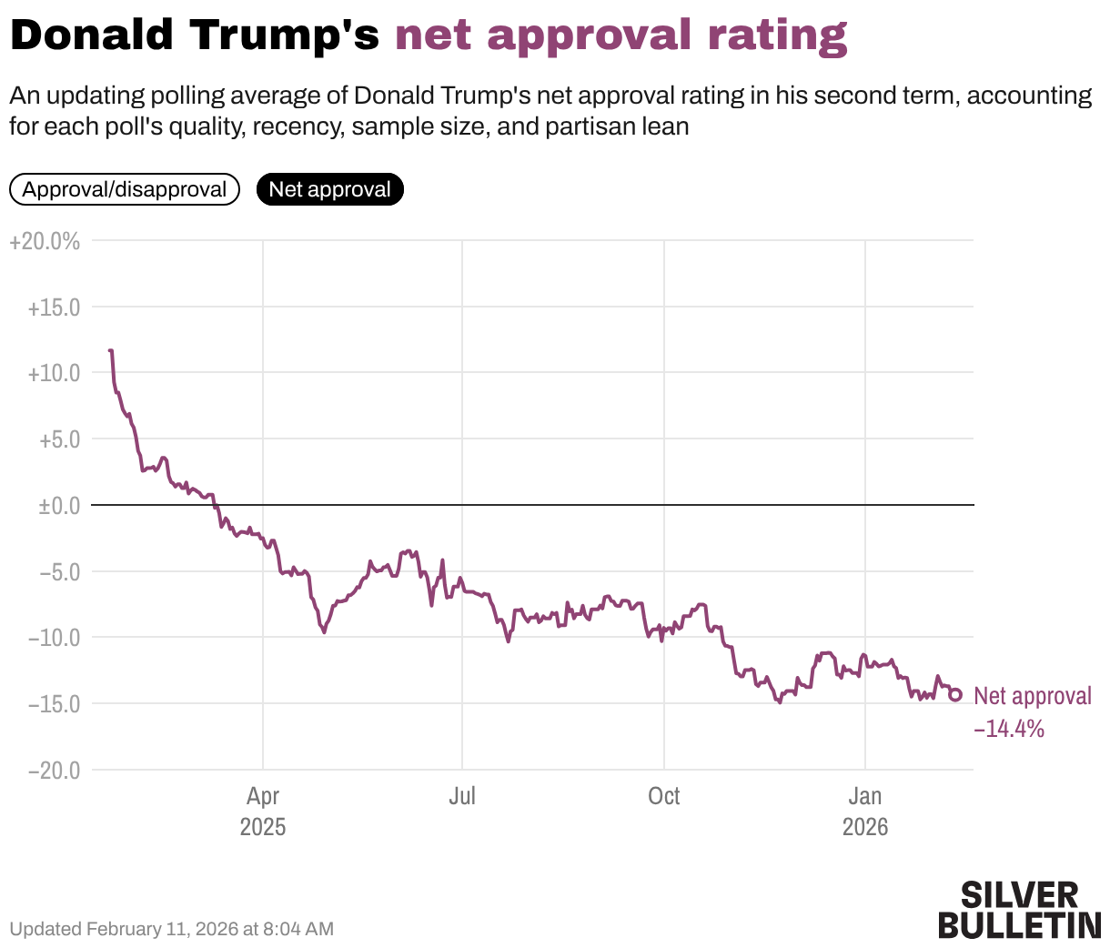 Donald Trump, too, started his second term with political capital, including (for the first time in his career) a positive approval rating. His net approval rating has gone from +11.7% on Day 1 to -14.4% today, so we can tell that he has spent it.